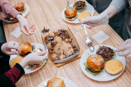 Burgers with beef and vegetables, the cooking process, hands collecting the burger. Delicious burgers in the cooking class. Burger with onion sauce. home food, cooking at home