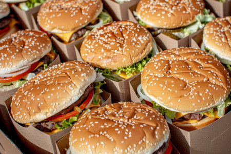 Freshly prepared burgers packed in boxes, perfectly sealed for delivery and utmost taste preservation.