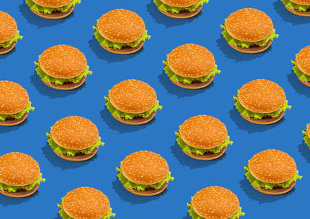 Tasty fresh hamburgers with lettuce and sesame bun on blue background, creative design, repeat pattern, top view
