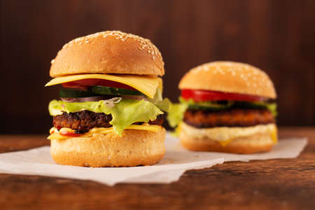Two hamburgers on a wooden background. Big and small cheeseburger. Hamburger day.