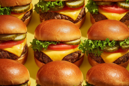Juicy cheeseburgers with melted cheese, fresh lettuce, pickles, and tomato sit in perfect rows on a bright yellow background, showing a feast for burger lovers.