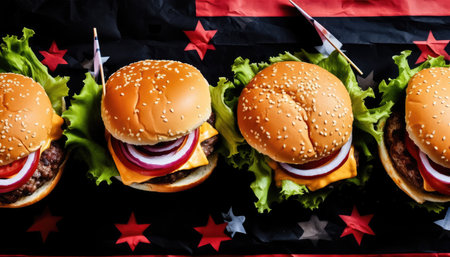 delicious burgers lined up in a row on the background of the american flag. illustration created by Generative AI