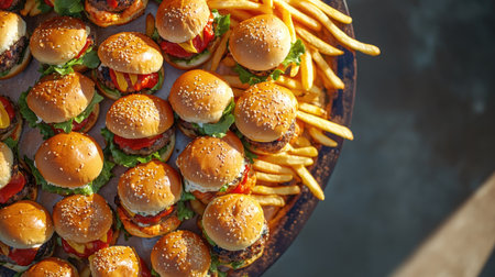 A platter of mini gourmet burgers served with crispy fries, festival, top view, copy space, no people