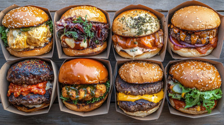 A variety of gourmet festival burgers with unique toppings, top view, copy space, no people