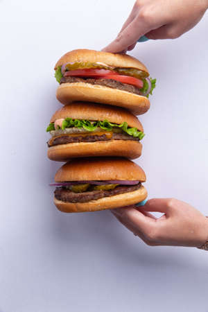 Photos of homemade burgers. Steak and white bun with sesame seeds, cheese and cabbage, tomatoes. Homemade food.