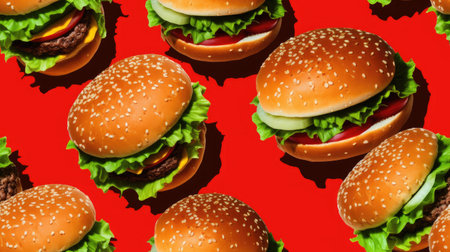 Many beef burgers cheeseburgers with vegetables and sauce pattern on red background.AI Generative.