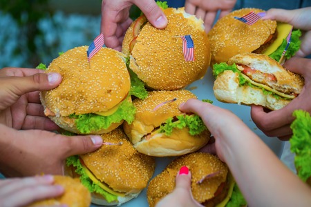 Many hands with delicious classic hamburgers fast food with lettuce salad sesame and american flags