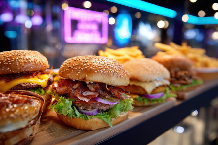 Gourmet burgers lined up at a vibrant food truck, neon signs glowing