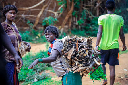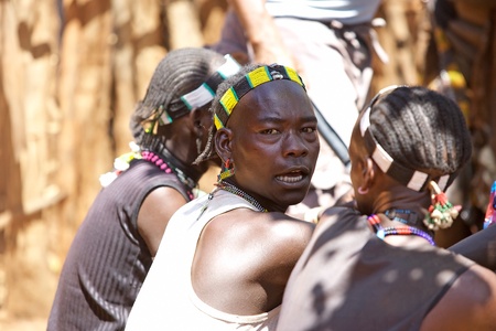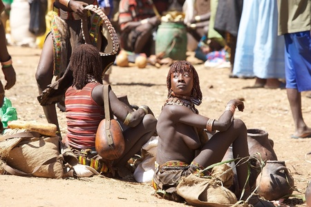 DIMEKA, OMO VALLEY, ETHIOPIA - 27 JULY 2013: The people from Hamer people on the local marketplace in Dimeka, Omo valley