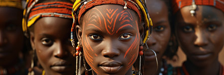 In a remote African village, women with intricately painted faces showcase the rich cultural heritage of their primitive tribe in a captivating image.