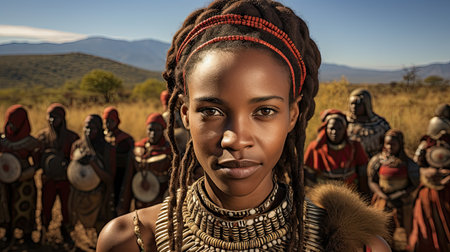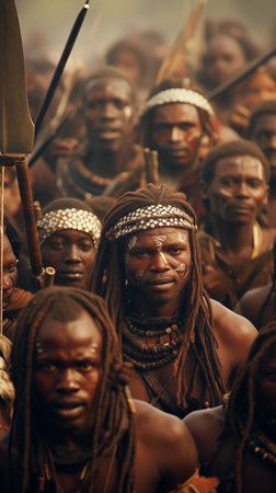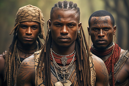 An AI generated illustration of African people wearing traditional headdresses standing in a forest