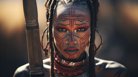 Female women from Africa with cultural tattoos make-up, cosmetics, and wooden stone spear weapon. ethnic groups of Africa