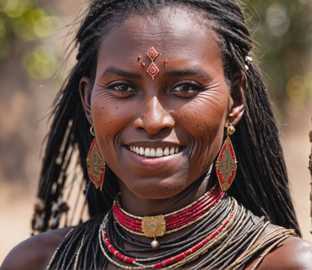 East African native lady grinning Put on some face paint and a headpiece. GENERATE AI
