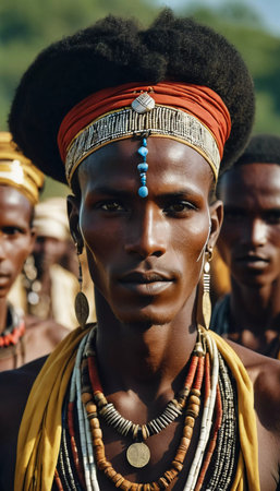 Wodaabe Mbororo community members engage in the vibrant Guerewol festival, showcasing their traditional attire, unique jewelry, and cultural expressions.