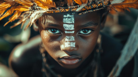 Portrait of a Young Child with Tribal Face Paint and a Decorative Feathered Headpiece. High quality photo