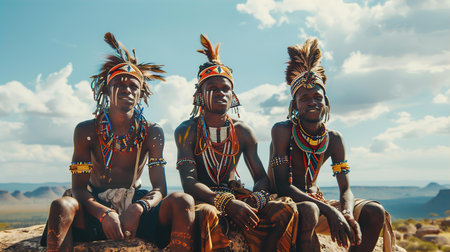 ortrait of Tree Young Indigenous African tribe men are sitting on a big stone and admiring landscape