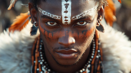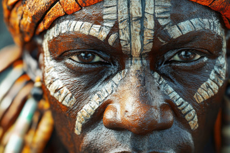 A tribal elder displays detailed face paint and a vibrant headdress, showcasing cultural identity and heritage. The elder's gaze is intense, reflecting wisdom and a deep connection to traditions during a celebration in nature.