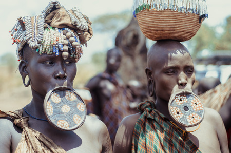 JINKA, ETHIOPIA, - 10AUGUST: unidentified women from Mursi tribe with big lip Plate, in Mago National Park, Jinka Ethiopia, on 10 August 2014. In the Mursi tribe, the more the lip plate is big, the more the woman is considered beautiful
