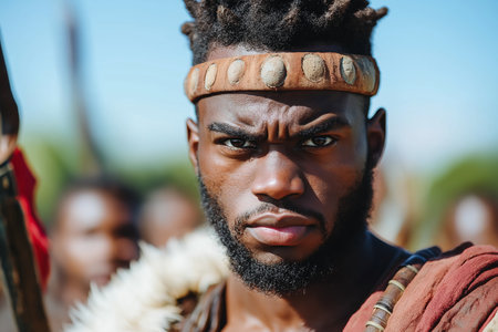 Portrait of a Focused Tribal Warrior with Traditional Attire and Spear.