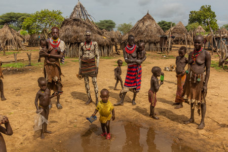 KORCHO, ETHIOPIA - FEBRUARY 4, 2020: Members of Karo tribe in their Korcho village, Ethiopia