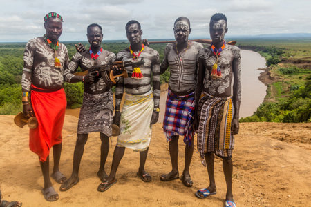 KORCHO, ETHIOPIA - FEBRUARY 4, 2020: Members of Karo tribe above Omo river near Korcho village, Ethiopia