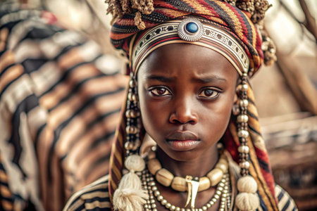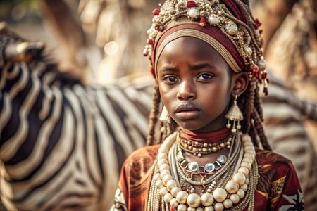 A beautiful black African girl in a traditional African national costume. Against the background of a zebra. The portrait symbolizes the traditions and beauty of the African people.