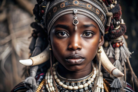 A beautiful black African girl in a traditional African national costume. Against the background of bones. The portrait symbolizes the traditions, culture and beauty of the African people.