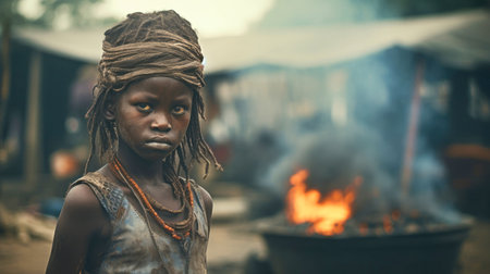 Portrait of a dark-skinned girl in the slums. A little girl looks at the camera with sad emotions. The problem of hunger and poverty in Africa