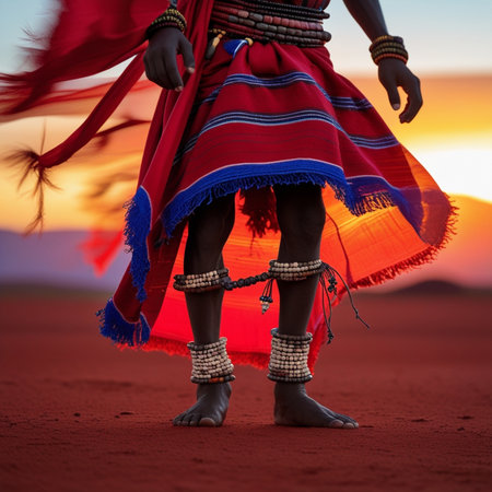 An indigenous African warrior stands proudly in a field, dressed in traditional attire and holding a spear, symbolizing strength.