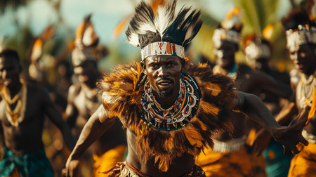 AI Generated. African Man Feathered Attire Village Ceremony