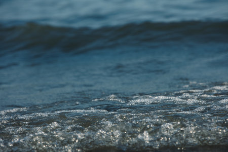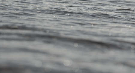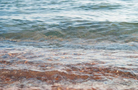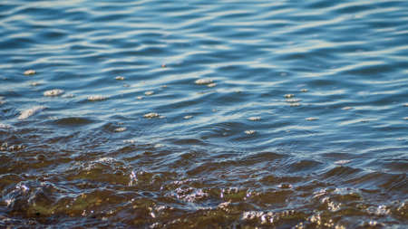 Close-up of water texture, smooth blue waves of water on the shore beach, color landscape photo of water