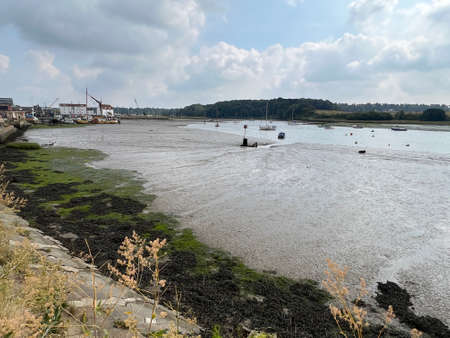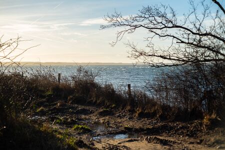 Oyster beach on to coastal area of lake Grevelingenmeer near the city of Scharendijke. Coastal landscape with oyster shells, blue sky and sailing boats on the lake. Zeeland, the Netherlands.