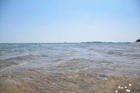 sandy beach and blue sea wave. Beautiful natural background. Tourism and travel