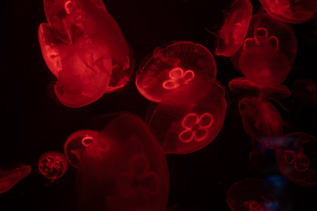 Beautiful jellyfish or medusa in the neon light in aquarium in new opened Prague medusarium in Czech Republic