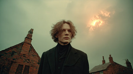 A man stands outdoors, facing the viewer with a solemn expression. The image features a shallow depth of field, with the focus on the subject and the sky. The lighting creates a dramatic atmosphere. This image is suitable for various commercial uses.