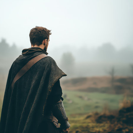 A lone warrior stands in a misty landscape contemplating the horizon as dawn breaks. The atmosphere is serene yet mysterious.