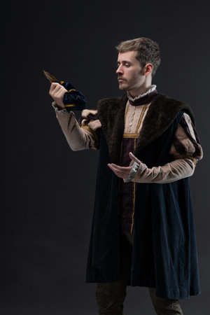 A young man portrays a romantic medieval hero wearing brocade clothing with a dramatic cape and beret, striking theatrical poses against a neutral gray studio background