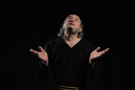 medieval monk in dark cassock looking up while praying with outstretched hands isolated on black