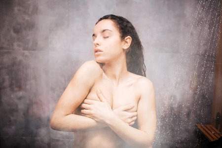 Lifestyle, sexy brunette Caucasian girl with towel at the end of the shower with sensual look, with pink led light, portraits inside the wet shower