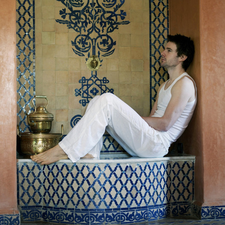 Handsome relaxed middle aged European man wrapped in a towel sitting on a marble surface in Turkish bath at wellness spa center. Body and skin care, purity, relaxation concept