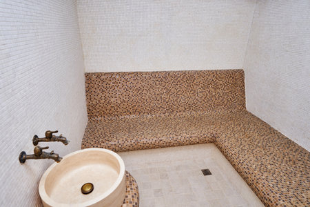 Tepidarium warm relaxing benches decorated with mosaic at the spa hotel. Tepidarium therapy room interior, wellness center.