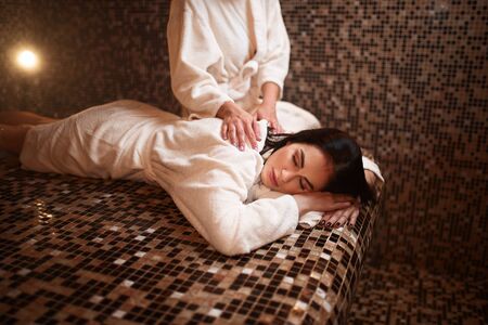 Calm atmosphere of hammam procedure and young lady in white towel enjoying it