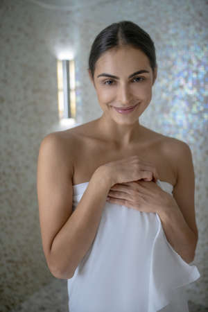 Body care. Smiling dark-haired female standing wrapped in white towel in sauna, hands on her chest