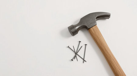 A high-quality image featuring a hammer and several nails resting on a vibrant pink background, perfect for showcasing DIY projects and construction themes.