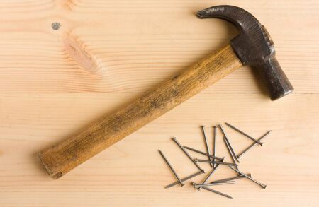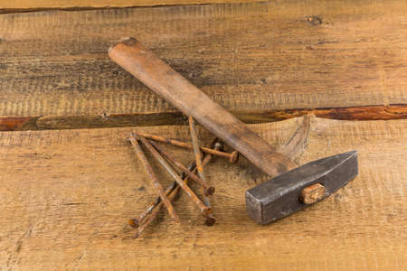 Old hammer with nails on the background of boards. Tools for construction work. Close-up.