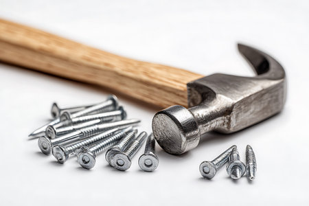A hammer and nails are on a wooden surface. Scene is somewhat chaotic and disorganized, as the nails are not neatly arranged with Generative AI