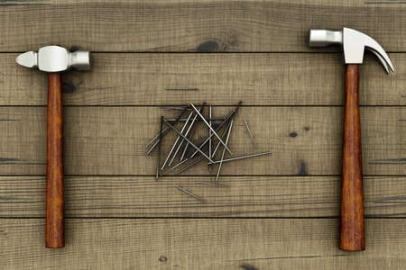 Hammers and nails on wooden surface