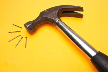 Old hammer and rusty nails. Yellow background.