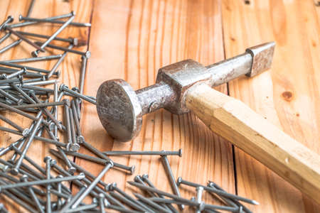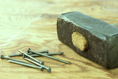 a large iron hammer and nails on a wooden surface. High quality photo