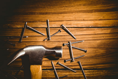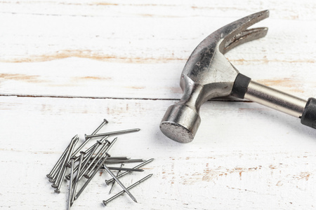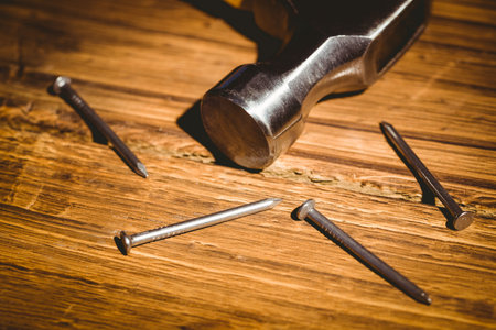 Hammer and nails laid out on table shot in studio